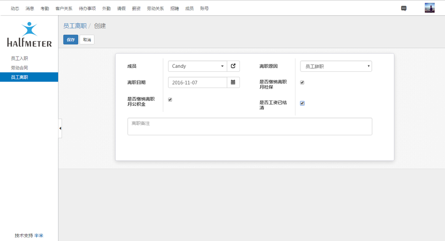3、员工离职:可以创建员工离职记录,包括是否缴纳离职月社保,离职原因,离职时间等,帮助企业做离职分析。