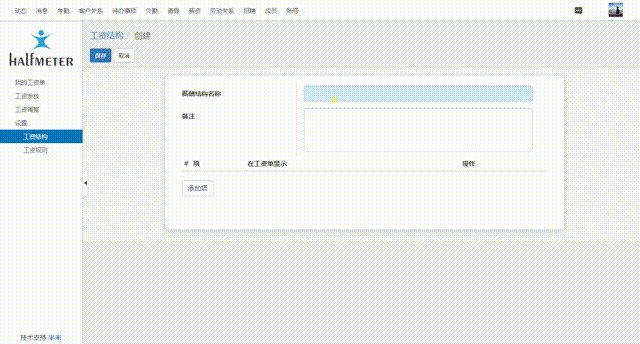 2、工资结构自定义:可以根据公司情况,设置包含不同工资项的薪酬结构,薪资结构名称和项目都可自定义选择编辑