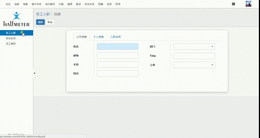 1、员工入职:为新进员工办理入职流程,填写基本人事资料,分为公开信息、个人信息和HR信息