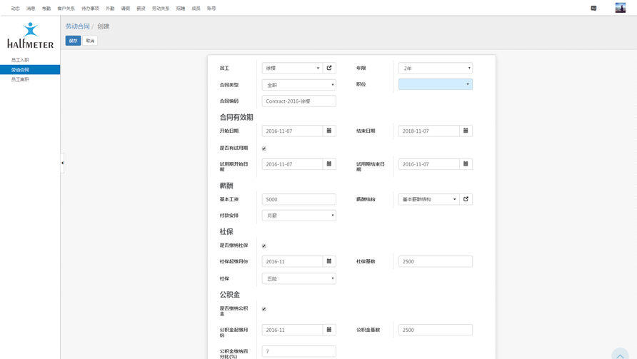 2、劳动合同:提供企业内部员工的劳动合同记录,包括合同有效期、薪酬、社保公积金安排,薪酬可以根据公司不同需求自行设置,满足企业个性化需求